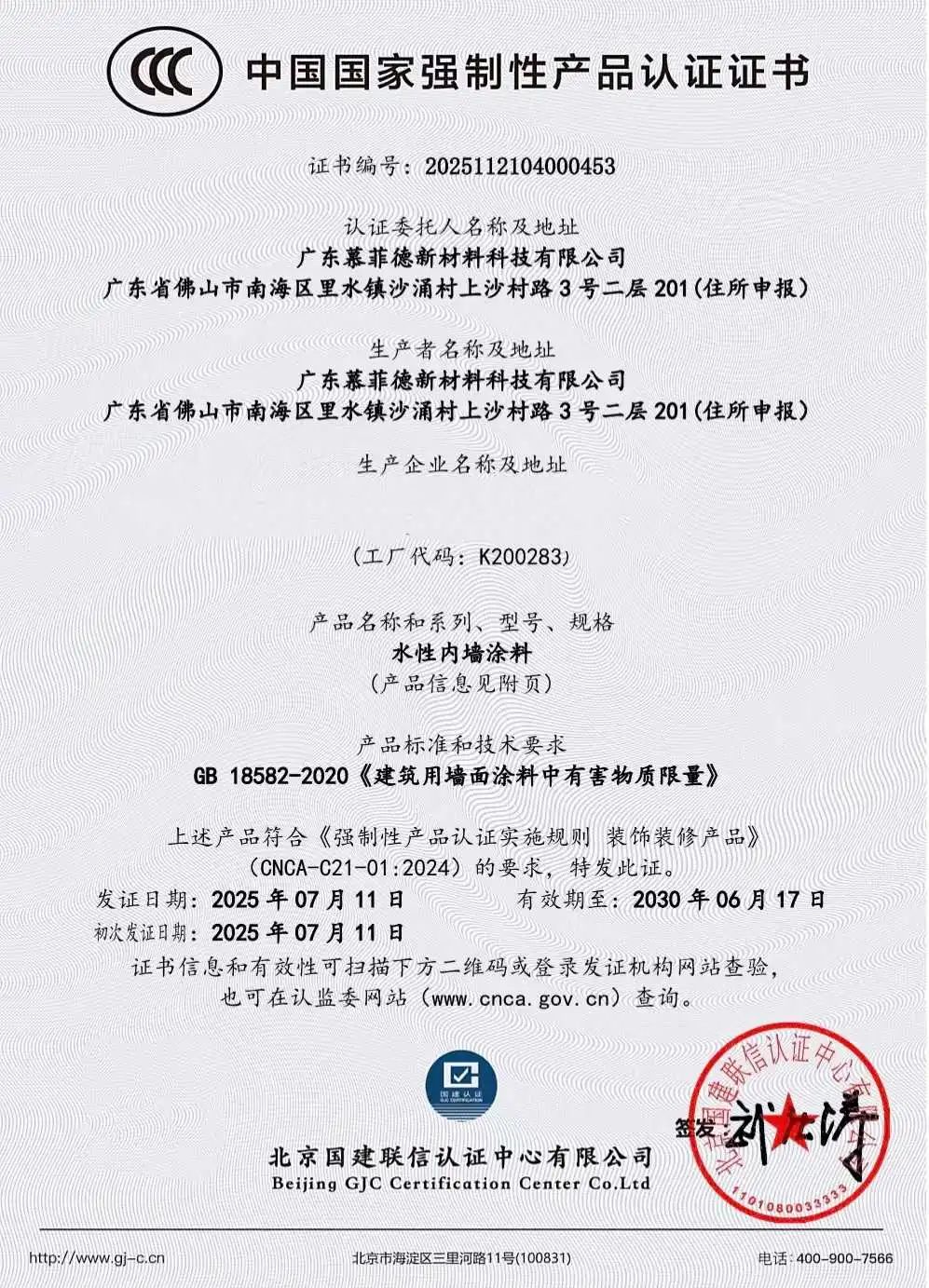 CCC认证是我国强制性产品认证制度,自2025年7月1日起,水性内墙涂料被纳入该认证管理范围。慕菲德的水性内墙涂料历经企业质量保证能力检查、型式试验等多轮严苛审查,符合《建筑用墙面涂料中有害物质限量》等强制性国家标准要求,在有害物质控制和性能稳定性上达到行业领先水平。